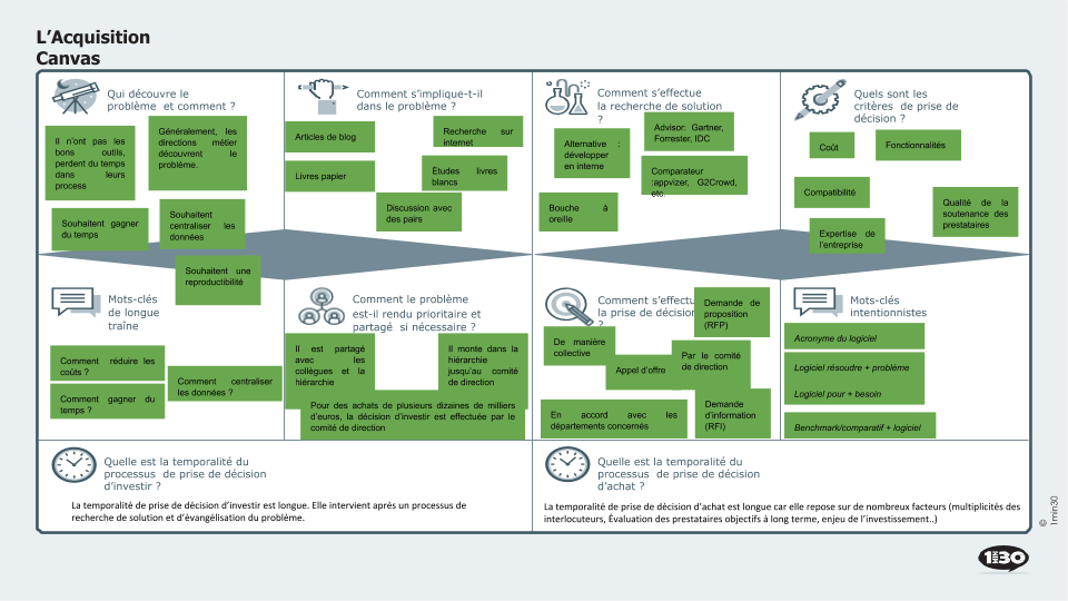 Dans notre exemple, l’Acquisition Canvas montre que la découverte du problème (inefficacité des processus de travail, mauvais outils, etc.) est généralement effectuée par les personnes en charge de diriger les métiers. Cette découverte est engendrée par un constat d’inefficacité, une recherche de gain de temps ou encore une volonté de centraliser les données.