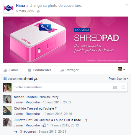 J’ai notamment en tête un exemple assez parlant, de Nana. Rappelez-vous : début 2015, l’agence BBDO de la marque a mené une véritable campagne de pub pour promouvoir son nouveau produit : le ShredPad, destructeur de serviettes hygiéniques (rien que ça !).