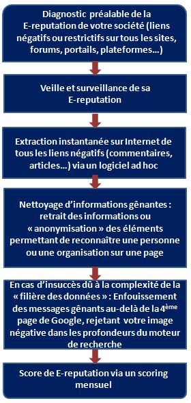 La technique de nettoyage consiste à négocier le retrait d’information malveillante en intervenant auprès du propriétaire des données et de l’hébergeur en mettant l’accent sur les conséquences pénales et financières du maintien des messages concernés.