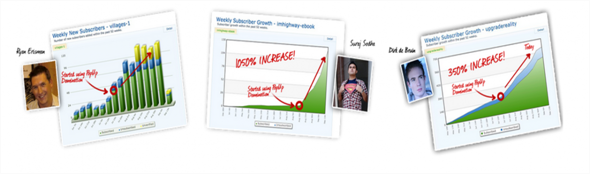 Dans cet extrait, tout est dit : si les pop up sont peu appréciés des utilisateurs, ils sont plébiscités par les entreprises car ils leur apportent de nouveaux lead. C’est évidemment bizarre, car si les utilisateurs ne les aiment pas, on a du mal à croire qu’ils jouent leur jeu… Et pourtant ! De nombreuses personnes témoignent de leur efficacité, chiffres à l’appui. Un des leaders de pop up aux Etats-Unis, « Pop up domination« , affiche par exemple sur son site des testimoniaux alléchants. Certains de leurs utilisateurs affirment avoir obtenu +1000% de taux de conversion, et l’entreprise promet une augmentation moyenne de +524% d’adresses mails recueillies par pop up. De quoi vaincre les résistances des plus réticents…
