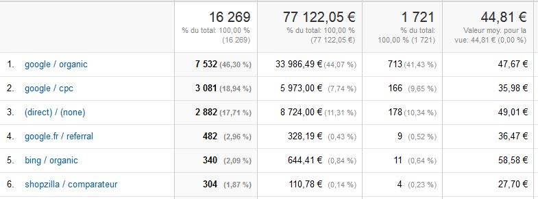 Imaginez que vous soyez l’heureux propriétaire d’un site e-commerce. Vous êtes présent sur les réseaux sociaux, sur Pinterest, sur des comparateurs de prix type Shopzilla, en référencement naturel, et vous faites de la publicité Adwords. Pour optimiser votre retour sur investissement, vous avez besoin de savoir ce qu’un euro investi sur chacun de ces canaux vous rapporte au final.Pour faire cela, vous allez généralement aller dans Google Analytics pour les data marketing, puis faire une analyse des ventes en fonction des canaux, ce qui vous donnera par exemple :