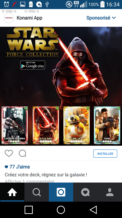 Publicité pour une application mobile. Simple photo présentant rapidement l’application et un call-to-action m’invitant à installer l’application.